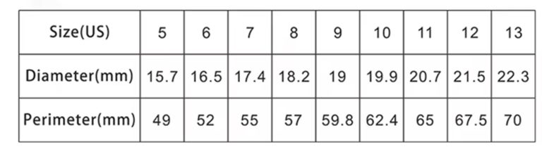 Compare the measurement to the Perimeter row in the chart below to find your ring size.